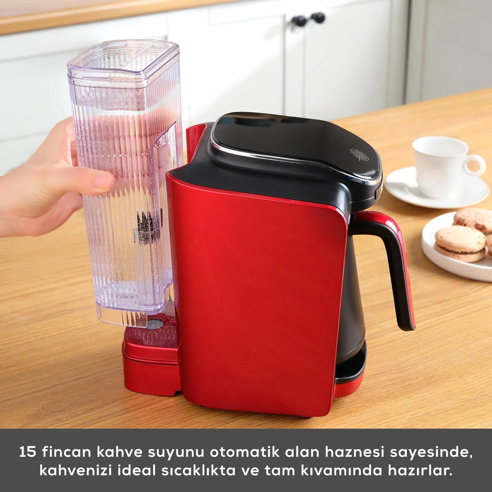Hatır Su, 900 ML su haznesi ile tek dolduruşta 15 fincana kadar kahve yapabilir.